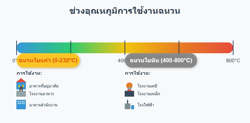 ฉนวนใยแก้วเหมาะสำหรับงานส่วนใหญ่ (90% ของการใช้งาน) ที่มีอุณหภูมิไม่เกิน 400°C ในขณะที่ฉนวนใยหินจำเป็นเฉพาะงานที่ต้องทนความร้อนสูงมาก