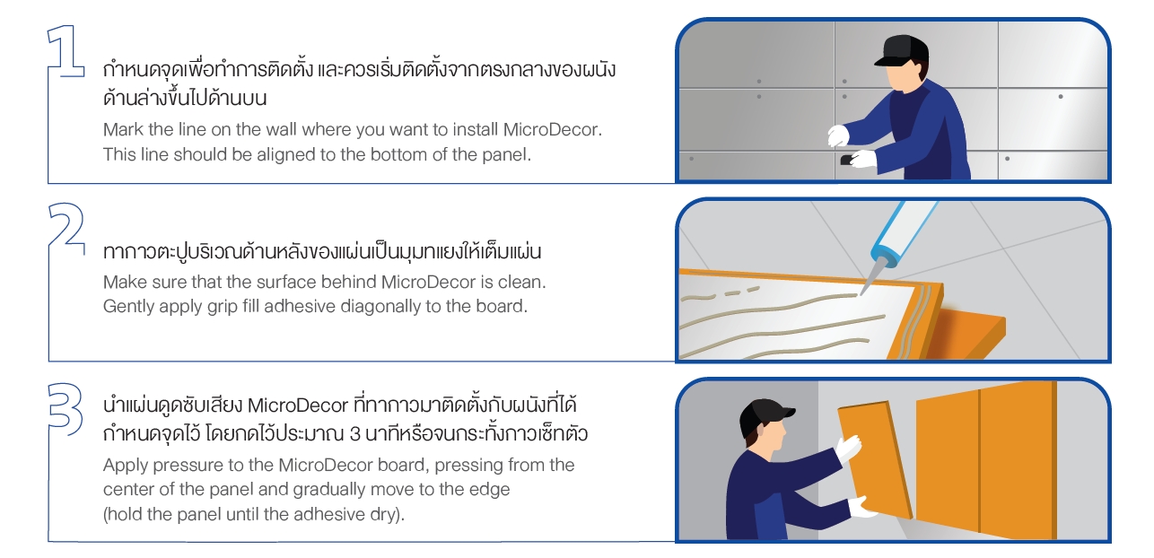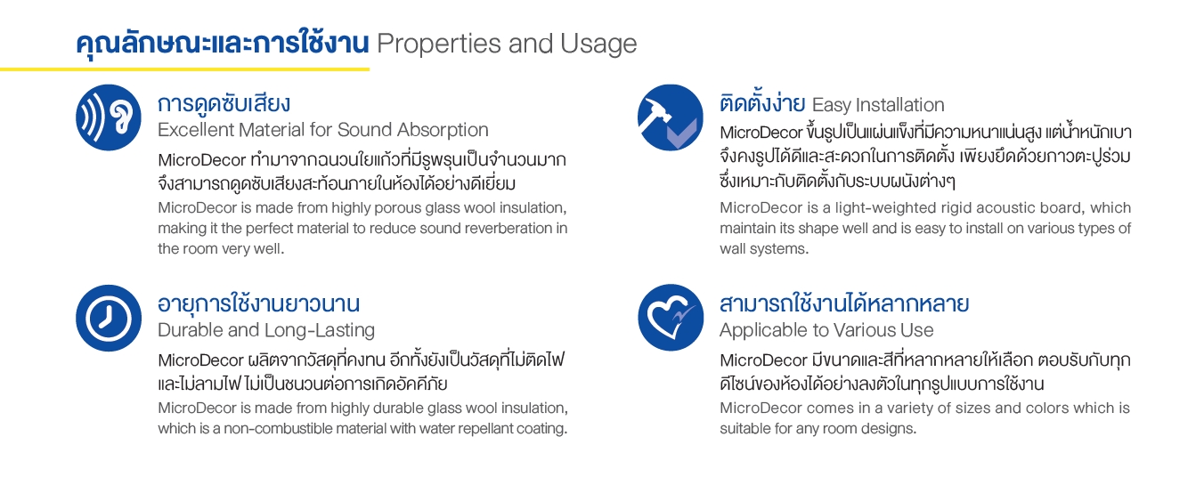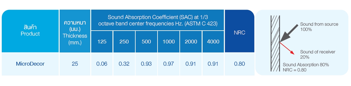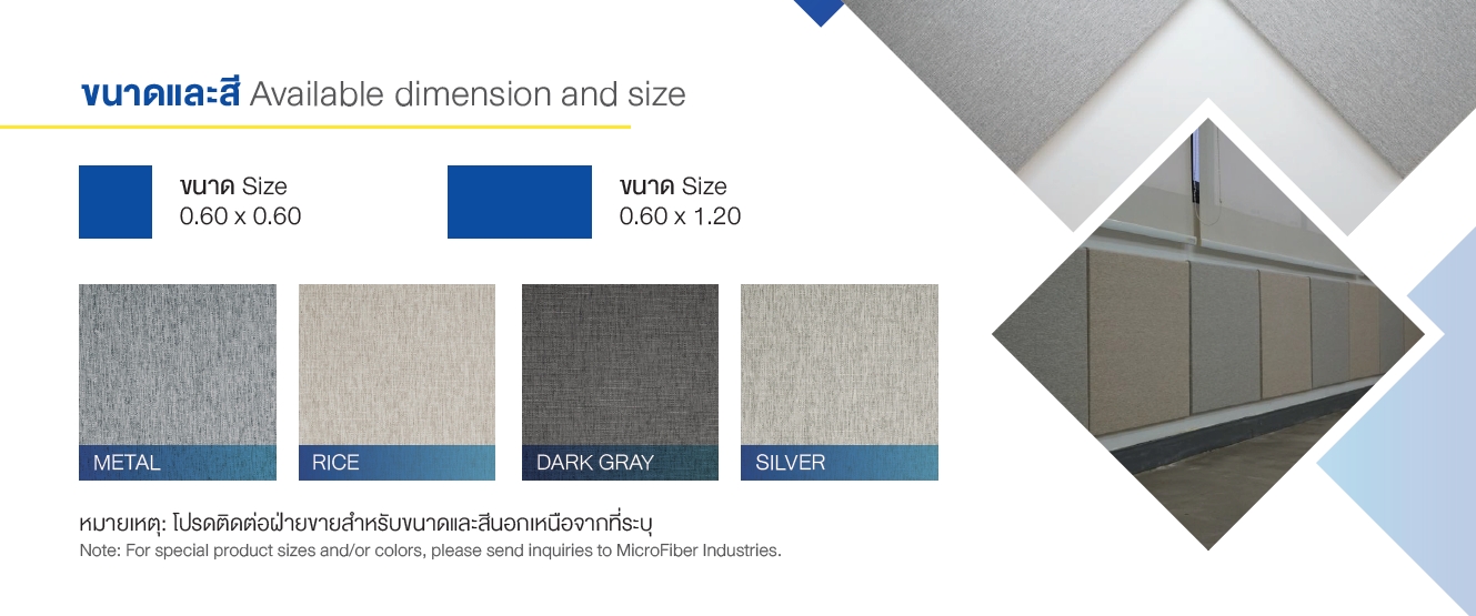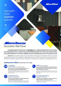 แผ่นดูดซับเสียงหุ้มผ้าสำหรับผนังตกแต่ง รุ่น MicroDecor สามารถใช้บุพนังเพื่อดูดชับเสียงสะท้อนภายในห้องและตกแต่งผนัง เพื่อความสวยงามผลิตจากแผ่นอนวนใยแก้วขึ้นรูปเป็นแผ่นแข็ง มีความหนาแน่นสูง และหับด้วยผ้าสีสันสวยงามที่มีระดับติดตังง่าย เหมาะสำหรับการติดตั้งใน ห้องประชุม ห้องอัดเสียง ห้องคาราโอเกะ หอประชุม โรงภาพยนต์