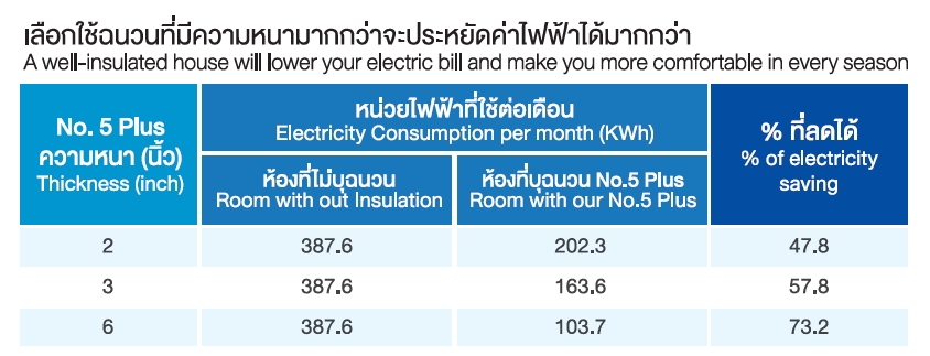 ตัวอย่าง : ติดตั้งฉนวนไมโครไฟเบอร์ เบอร์ 5 plus รุ่น 3 นิ้ว ในห้อง ขนาดพื้นที่ 21 ตรม. ลงทุน 4,800 บาท ประหยัดค่าไฟฟ้าได้เดือนละ 667,50 บาท คืนทุนภายใน ระยะเวลา ประมาณ 7 เดือน